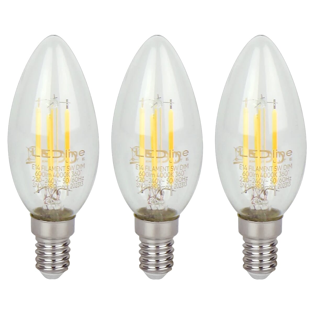 De LED line LITE LED Filament Kaarslamp C35 E14 is een energiezuinige lichtbron die traditionele gloeilampen van 50W vervangt. Deze lamp heeft een vermogen van 5W en levert een lichtopbrengst van 600 lumen. Met een diameter van 35 mm en een standaard E14 fitting is deze lamp geschikt voor diverse armaturen in huis. De lamp is dimbaar, waardoor je de lichtintensiteit naar wens kunt aanpassen.