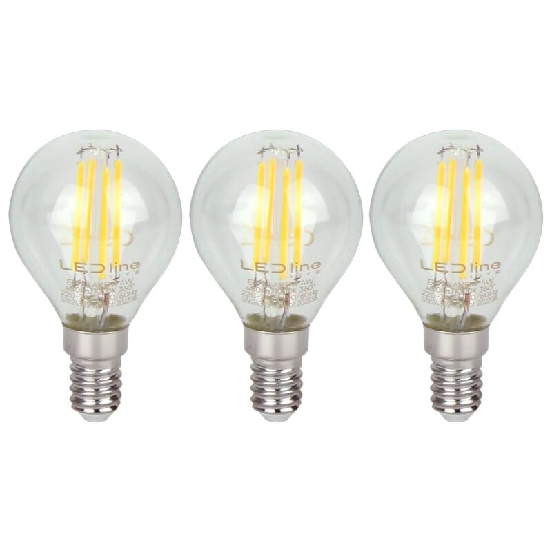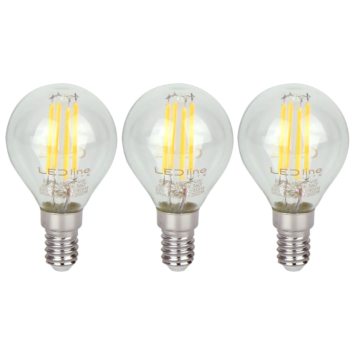 De LED line LITE LED Filament Kogellamp G45 E14 is een energiezuinige lichtbron die traditionele gloeilampen van 40W vervangt. Met een vermogen van slechts 4W biedt deze lamp een lichtopbrengst van 480 lumen. De lamp heeft een diameter van 45 mm en werkt op een spanning van 230V. Deze set bevat drie stuks, ideaal voor gebruik in verschillende armaturen binnen huiselijke of commerciële omgevingen.