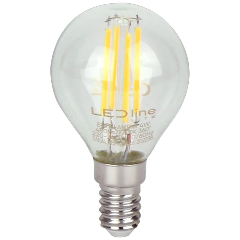 De LED line LITE LED Filament Kogellamp G45 E14 is een energiezuinige lichtbron die ontworpen is om traditionele 40W gloeilampen te vervangen. Met een vermogen van slechts 4W biedt deze lamp een lichtopbrengst van 480 lumen, wat zorgt voor een heldere en efficiënte verlichting. De lamp heeft een diameter van 45mm en werkt op een standaard netspanning van 230V, waardoor hij geschikt is voor diverse toepassingen in huis.