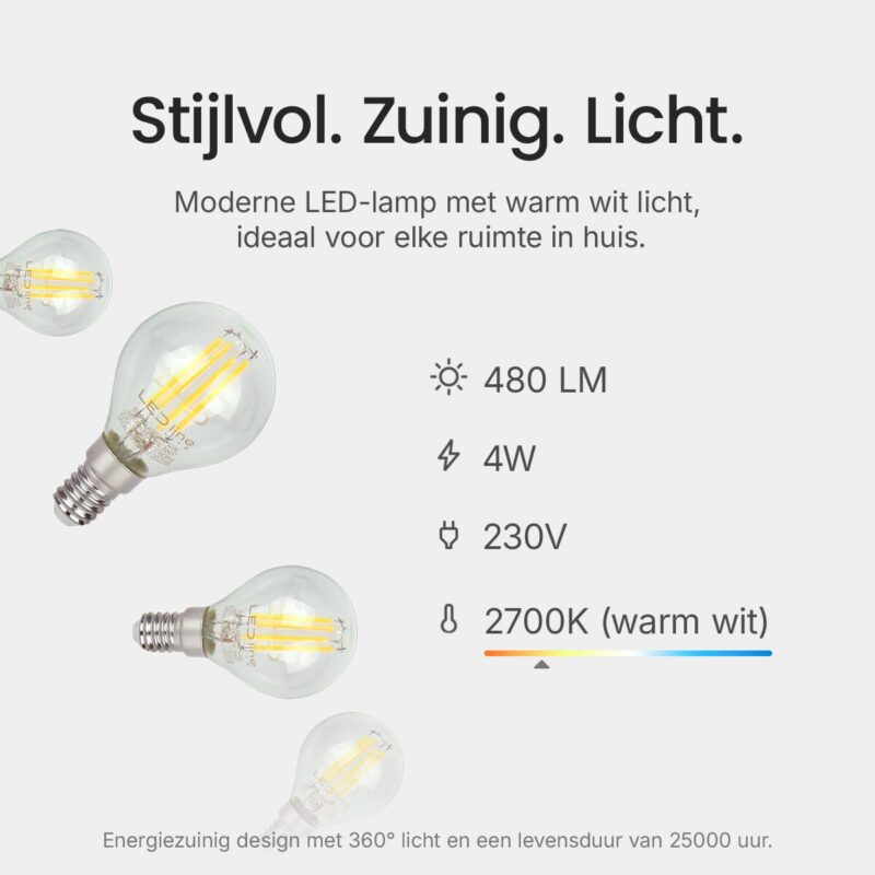 De LED line LITE kogellamp is ontworpen met energie-efficiëntie in gedachten. Met een verbruik van slechts 4W bespaart deze lamp aanzienlijk op energiekosten in vergelijking met traditionele gloeilampen, zonder in te boeten op lichtkwaliteit.