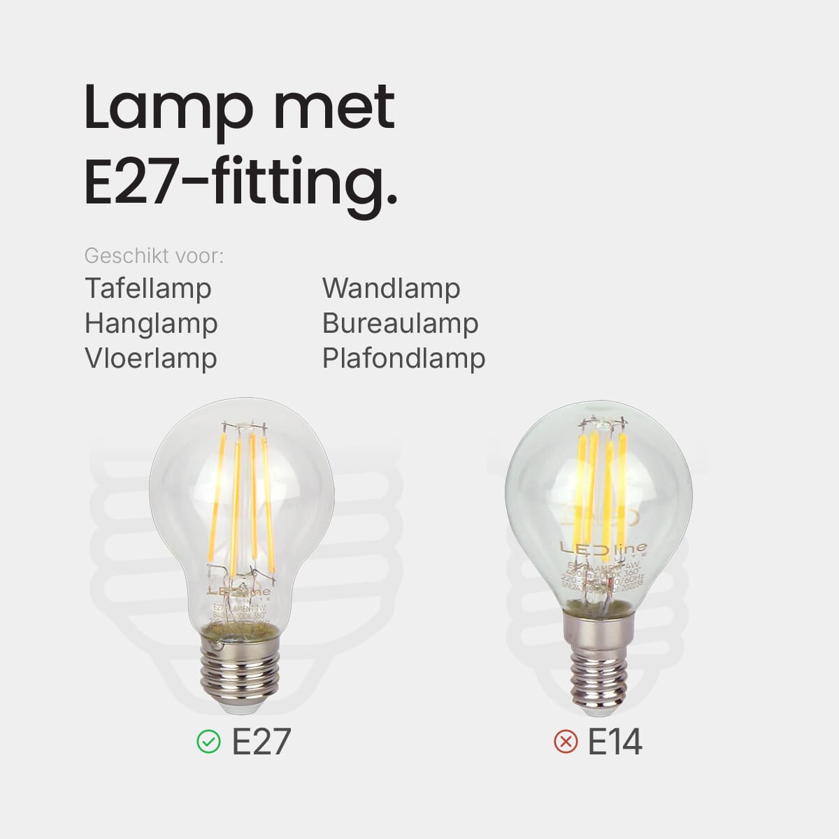 De lamp is voorzien van een standaard E27 fitting, waardoor hij compatibel is met de meeste lampen en armaturen, wat de installatie eenvoudig en probleemloos maakt.