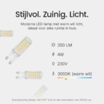 De LED line LITE LED Insteeklamp G9 is ontworpen met energie-efficiëntie in gedachten. Met een verbruik van slechts 4W bespaart deze lamp aanzienlijk op energiekosten in vergelijking met traditionele 30W lampen.