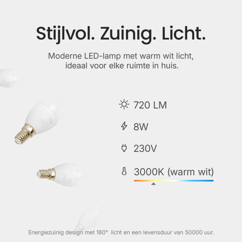 De LED line LITE Kaarslamp is ontworpen met energie-efficiëntie in gedachten. Met een verbruik van slechts 8W bespaart deze lamp aanzienlijk op energiekosten in vergelijking met traditionele gloeilampen van 60W.