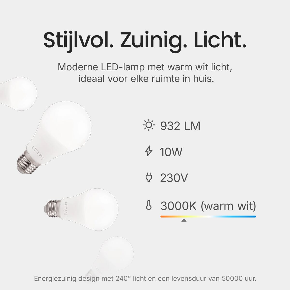 De LED line LITE LED Lamp A60 E27 is een energiezuinige lichtbron die ontworpen is om traditionele 80W gloeilampen te vervangen. Met een vermogen van slechts 10W biedt deze lamp een lichtopbrengst van 932 lumen, wat zorgt voor een heldere en efficiënte verlichting in diverse ruimtes. De lamp heeft een standaard E27 fitting en een diameter van 60mm, waardoor hij eenvoudig in bestaande armaturen kan worden geplaatst.