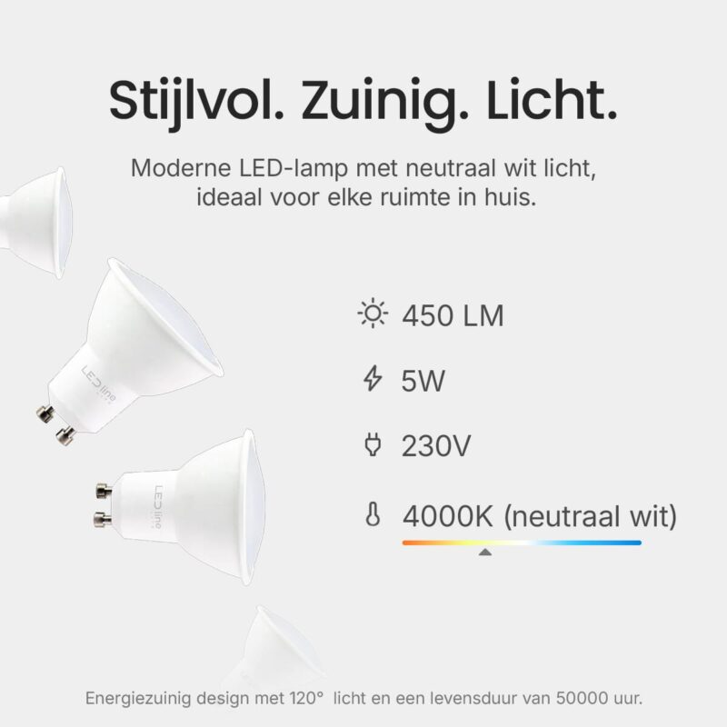 De LED line LITE LED Spot GU10 is ontworpen met energie-efficiëntie in gedachten. Met een verbruik van slechts 5W bespaart deze spot aanzienlijk op energiekosten in vergelijking met traditionele 40W halogeenlampen.