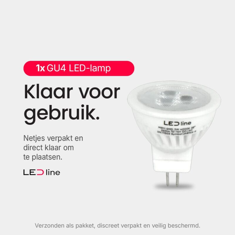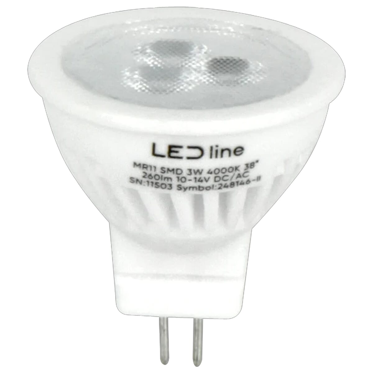 De LED line PRIME LED Spot GU4 MR11 is een energiezuinige verlichtingsoplossing die ontworpen is om traditionele 30W halogeenlampen te vervangen. Met een vermogen van slechts 3W biedt deze LED spot een lichtopbrengst van 330 lumen, wat zorgt voor een heldere en efficiënte verlichting. De spot heeft een diameter van 35 mm en werkt op een spanning van 12V, waardoor hij geschikt is voor diverse toepassingen in huis en commerciële omgevingen.