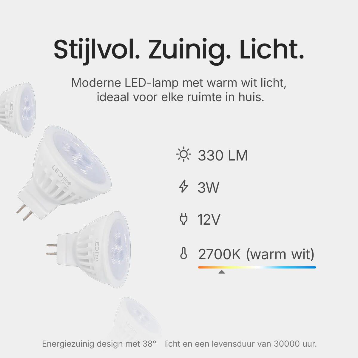 De LED line PRIME LED Spot is ontworpen met energie-efficiëntie in gedachten. Met een verbruik van slechts 3W bespaart deze spot aanzienlijk op energiekosten in vergelijking met traditionele halogeenlampen van 30W.