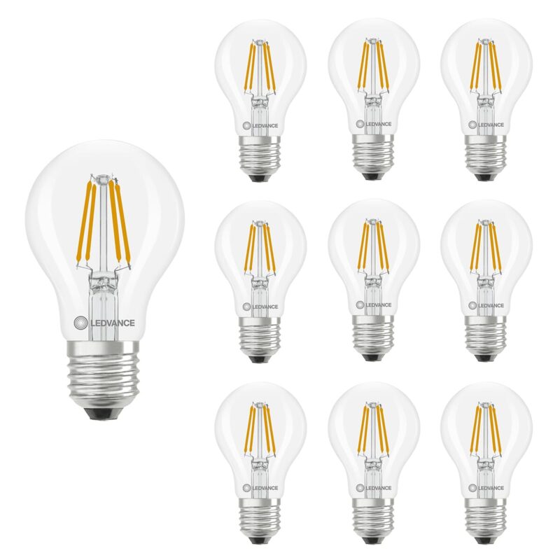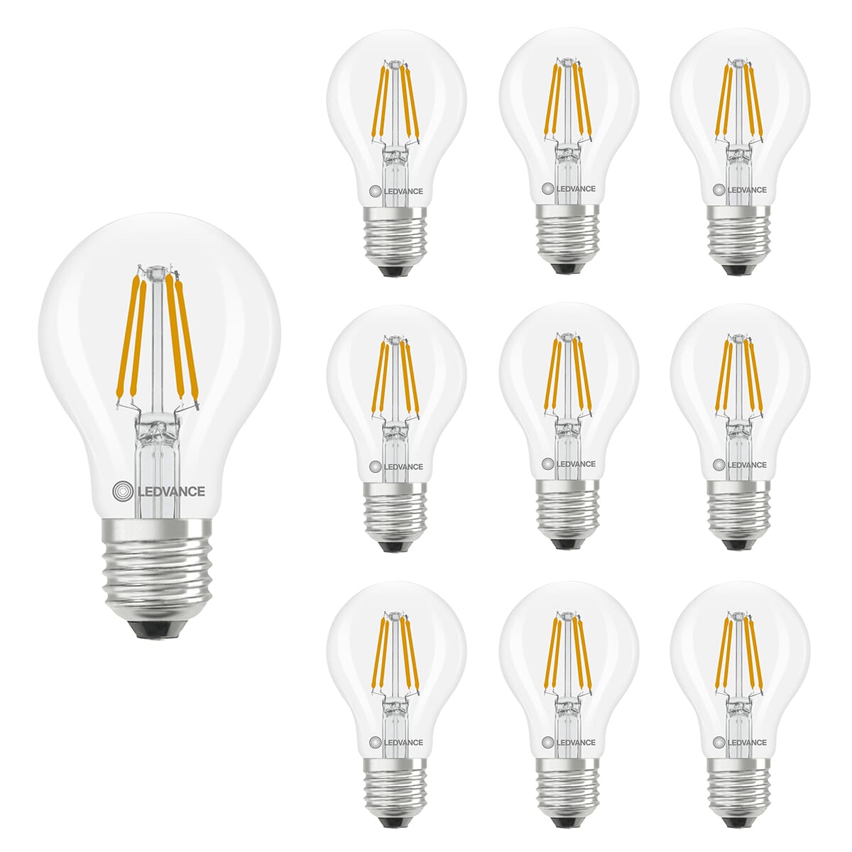 De Ledvance LED Classic A60 Filament Lamp E27 is een energiezuinige lichtbron die geschikt is voor diverse toepassingen in huis. Met een vermogen van 3.4W en een lichtopbrengst van 470 lumen, biedt deze lamp helder en efficiënt licht. De lamp heeft een kleurtemperatuur van 4000K, wat zorgt voor een koel wit licht, ideaal voor ruimtes zoals keukens, leeslampen en studeerkamers. Deze lampen worden geleverd in een set van 10 stuks, waardoor je meerdere ruimtes kunt verlichten.