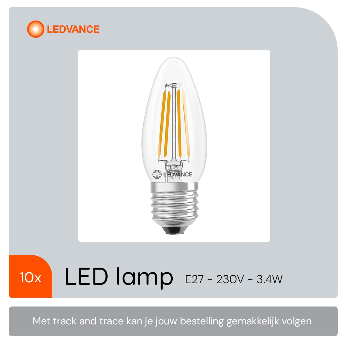 De Ledvance LED Classic B35 Filament Lamp E27 is een energiezuinige LED-kaarslamp die ontworpen is om traditionele gloeilampen te vervangen. Met een vermogen van 3.4W levert deze lamp een lichtopbrengst van 470 lumen en een warme kleurtemperatuur van 2700K. Deze lamp is geschikt voor gebruik in wandlampen en andere armaturen met een E27 fitting. De verpakking bevat 10 stuks, ideaal voor grotere verlichtingsprojecten.