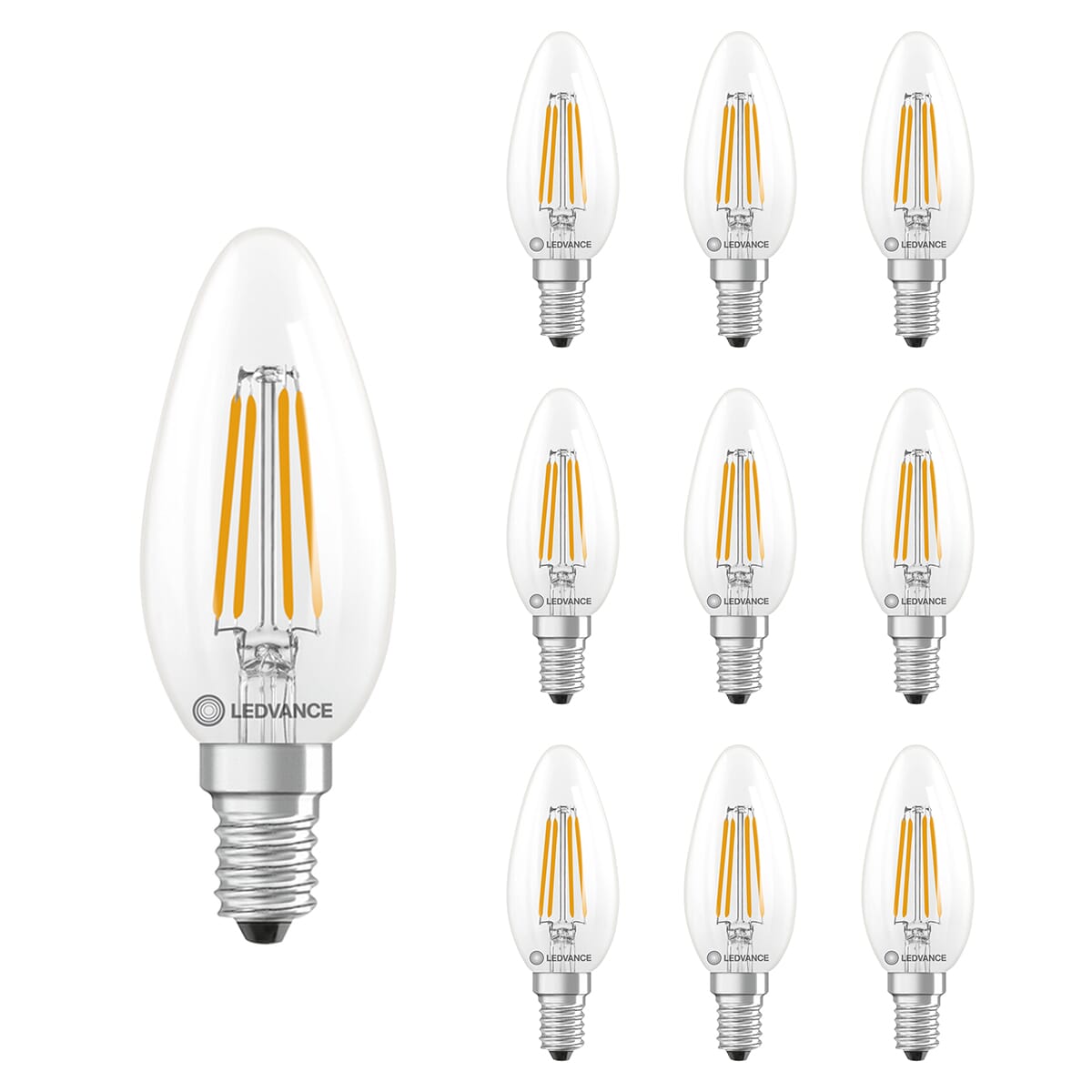 De Ledvance LED Classic B35 Kaarslamp E14 is een energiezuinige lichtbron die ontworpen is om traditionele 40W gloeilampen te vervangen. Met een vermogen van 3.4W en een lichtopbrengst van 470 lumen, biedt deze lamp een warm wit licht van 2700K. Deze kogellamp is geschikt voor gebruik in nachtlampjes en tafellampen, en wordt geleverd in een verpakking van 10 stuks.