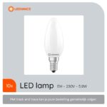 De Ledvance LED Filament Kaarslamp E14 is een energiezuinige lichtbron die ideaal is voor gebruik in kroonluchters, hotels en klassieke armaturen. Met een vermogen van 5.9W en een lichtopbrengst van 806 lumen, biedt deze lamp een warm wit licht van 2700K. De lamp is voorzien van mat glas en heeft een diameter van 35mm. Deze set bevat 10 stuks, wat het een praktische keuze maakt voor grotere installaties.