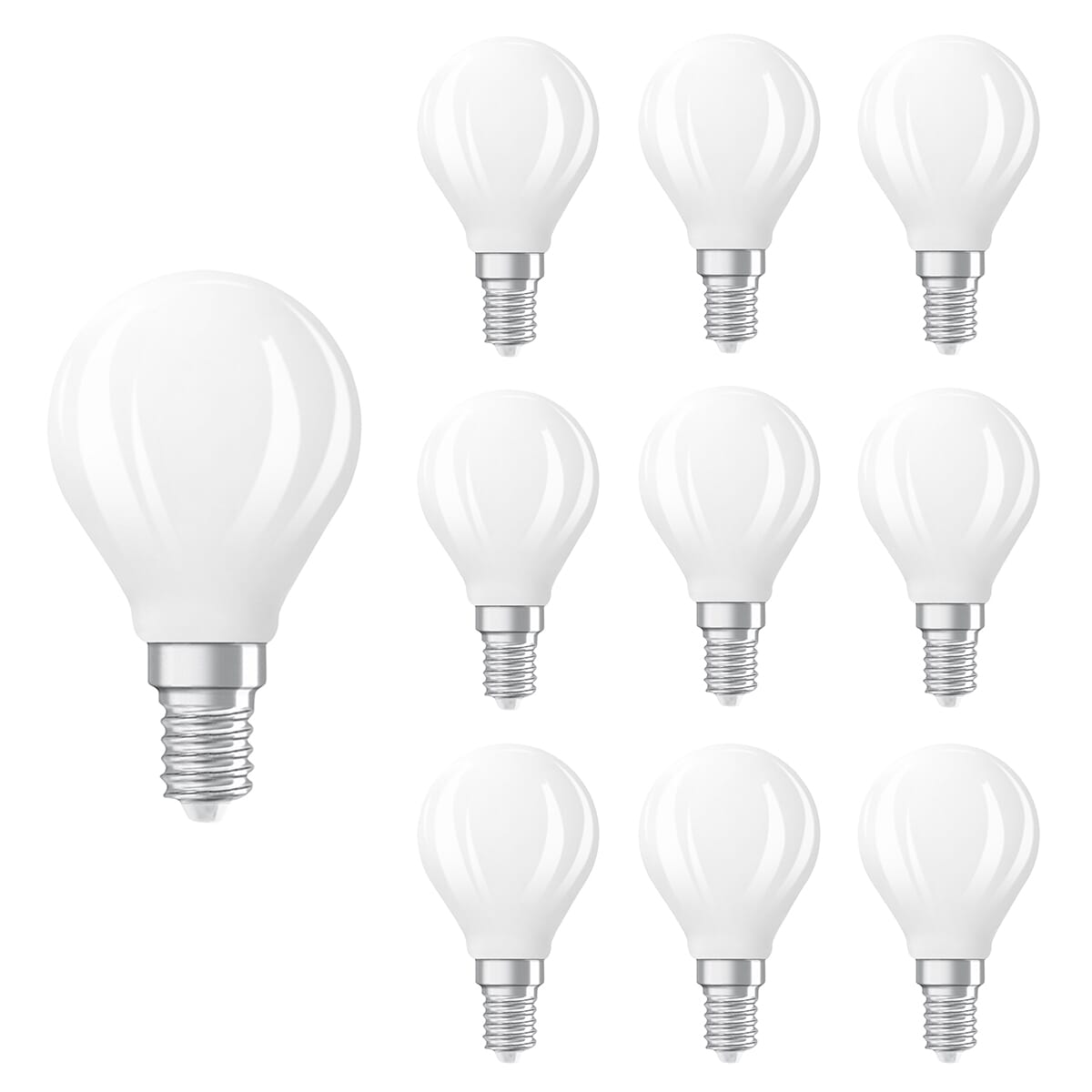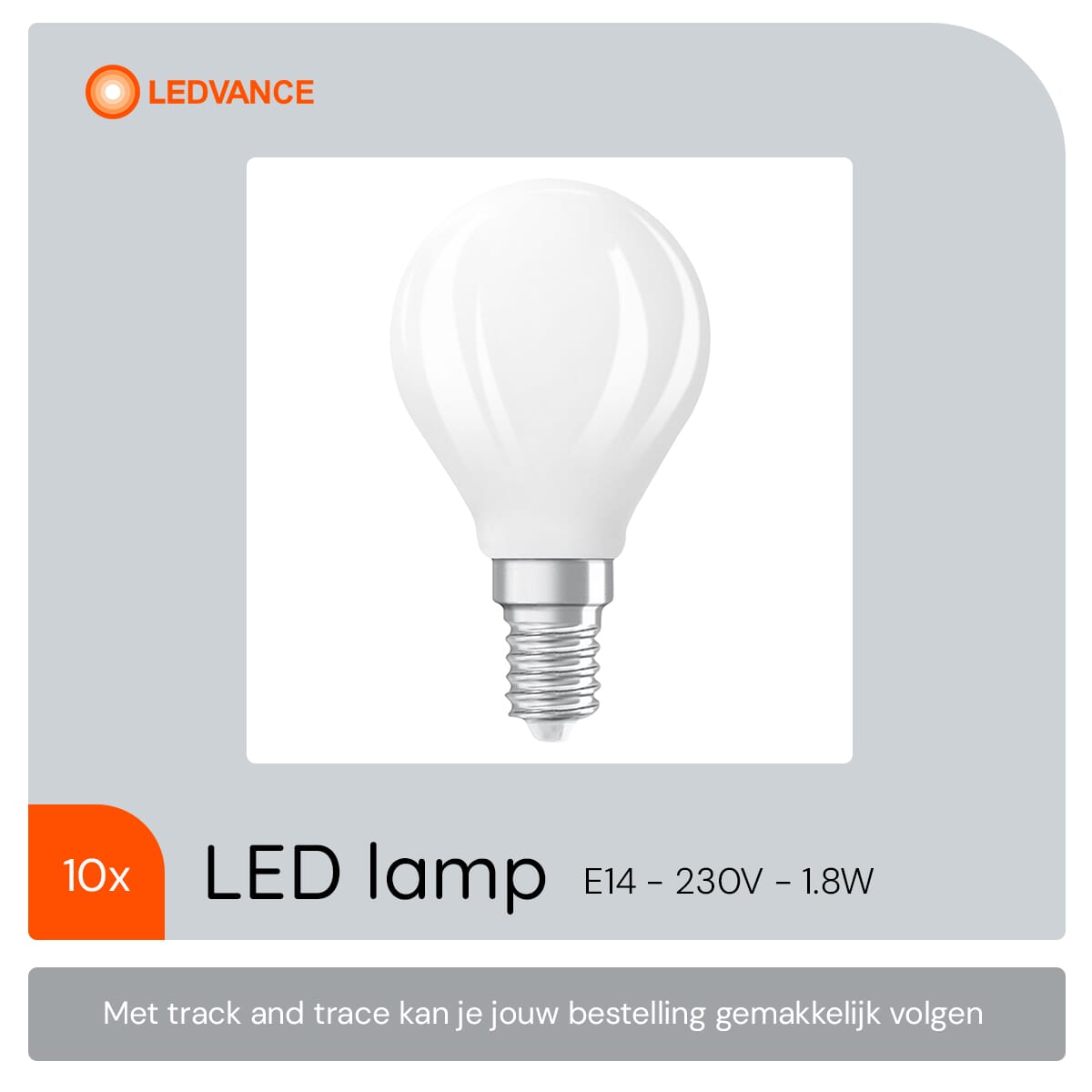 De Ledvance LED Filament Kogellamp E14 is een energiezuinige lichtbron die ideaal is voor gebruik in nachtlampen, hotels en sfeerverlichting. Met een vermogen van 1.8W en een lichtopbrengst van 250 lumen, biedt deze lamp een warm wit licht van 2700K. De lamp is voorzien van mat glas en heeft een diameter van 45mm. Deze set bevat 10 stuks, waardoor het een praktische keuze is voor grotere verlichtingsprojecten.