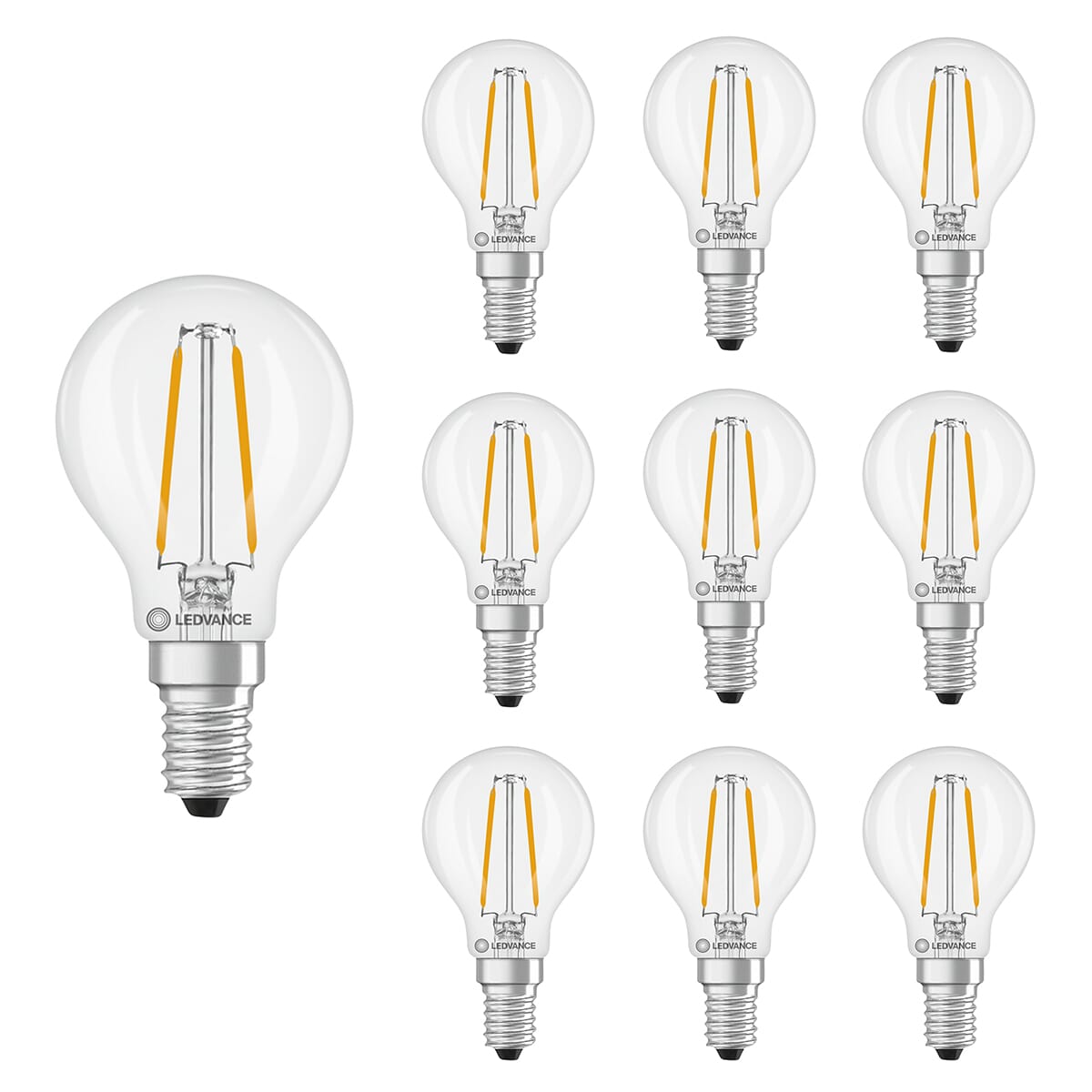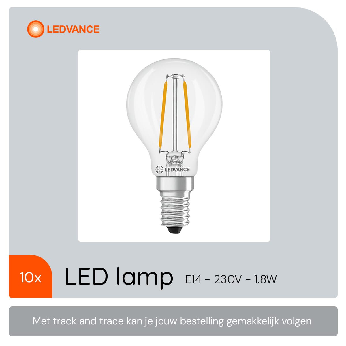 De Ledvance LED Filament Kogellamp E14 is een energiezuinige lichtbron die ideaal is voor gebruik in vitrinekasten, decoratieve lampen en bijzettafels. Met een vermogen van 1.8W en een lichtopbrengst van 250 lumen, biedt deze lamp een warm wit licht van 2700K. De lamp heeft een helder glasontwerp en een diameter van 45mm, wat zorgt voor een klassieke uitstraling in elke ruimte.