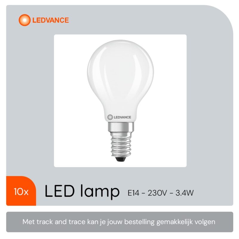De Ledvance LED Filament Kogellamp E14 is een energiezuinige lichtbron die ideaal is voor sfeerverlichting in slaapkamers en hallen. Met een vermogen van 3.4W en een lichtopbrengst van 470 lumen, biedt deze lamp een warm wit licht van 2700K. De lamp is voorzien van mat glas en heeft een diameter van 45mm, waardoor het een subtiele en stijlvolle toevoeging is aan elk interieur. Deze set bevat 10 stuks, wat het een praktische keuze maakt voor grotere verlichtingsprojecten.
