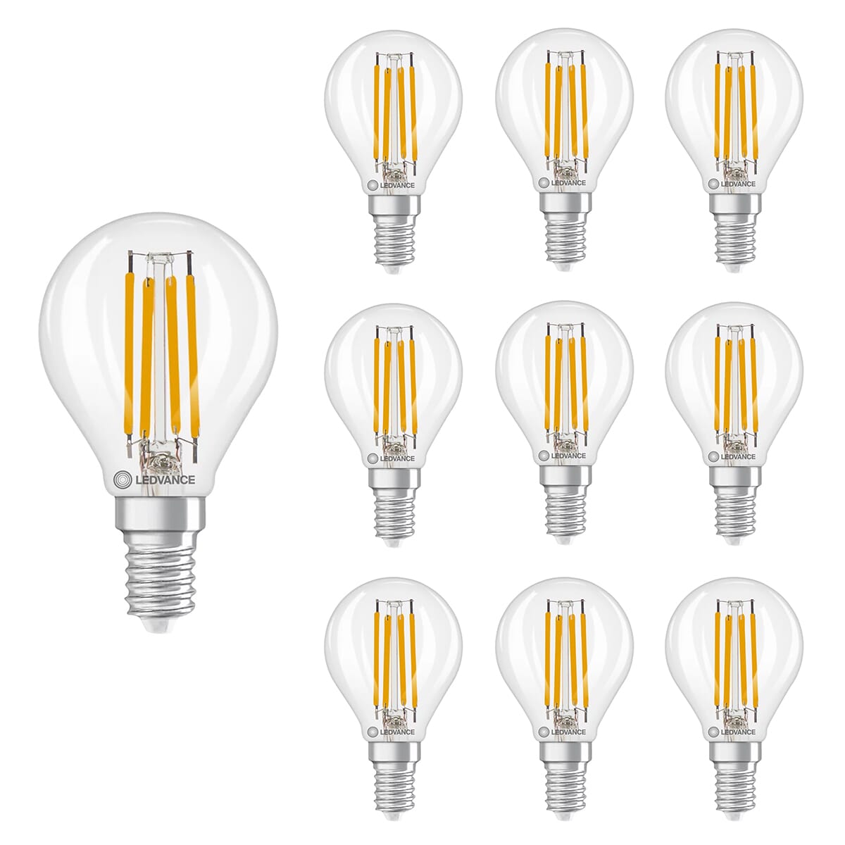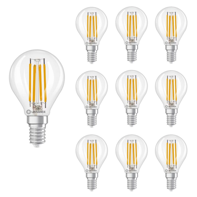 De Ledvance LED Filament Kogellamp E14 is een energiezuinige lichtbron die een warme, sfeervolle verlichting biedt. Met een vermogen van 3.4W en een lichtopbrengst van 470 lumen, is deze lamp geschikt voor diverse toepassingen zoals woonkamers, restaurants en decoratieve doeleinden. De lamp heeft een helder glas en een kleurtemperatuur van 2700K, wat zorgt voor een warm wit licht. Deze set bevat 10 stuks, ideaal voor grotere ruimtes of meerdere armaturen.
