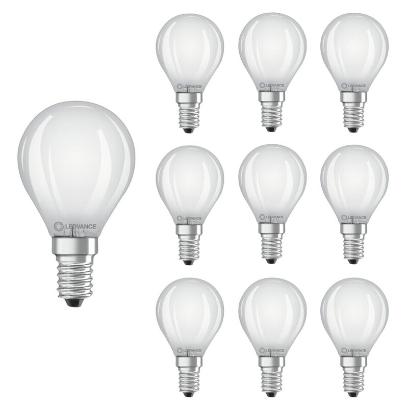De Ledvance LED Filament Kogellamp E14 is een energiezuinige lichtbron die ideaal is voor gebruik in nachtlampen, horecaomgevingen en hallen. Met een vermogen van 4W en een lichtopbrengst van 470 lumen biedt deze lamp een warm wit licht van 2700K, wat zorgt voor een aangename en sfeervolle verlichting. De lamp heeft een matte afwerking en een diameter van 45mm, waardoor hij geschikt is voor diverse armaturen.