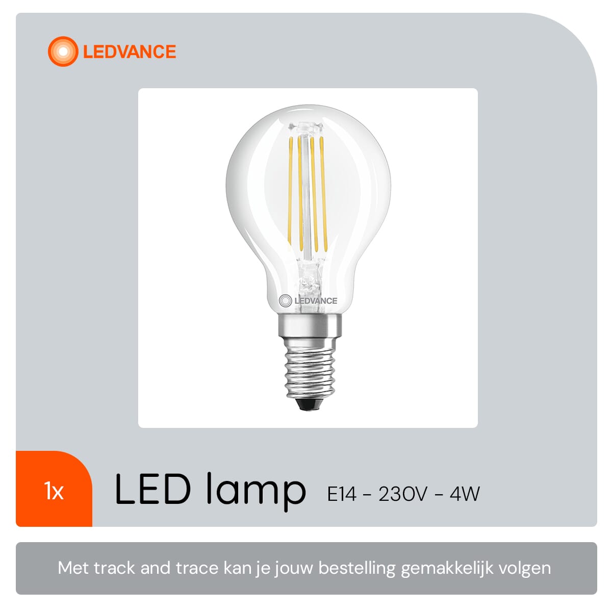 De Ledvance LED Filament Kogellamp E14 is een energiezuinige lichtbron die een klassieke uitstraling combineert met moderne LED-technologie. Deze lamp is ontworpen voor gebruik in kroonluchters, woonkamer- en eetkamerlampen, en biedt een warme, sfeervolle verlichting. Met een vermogen van 4W en een lichtopbrengst van 470 lumen, is deze lamp een efficiënte vervanger voor traditionele gloeilampen.