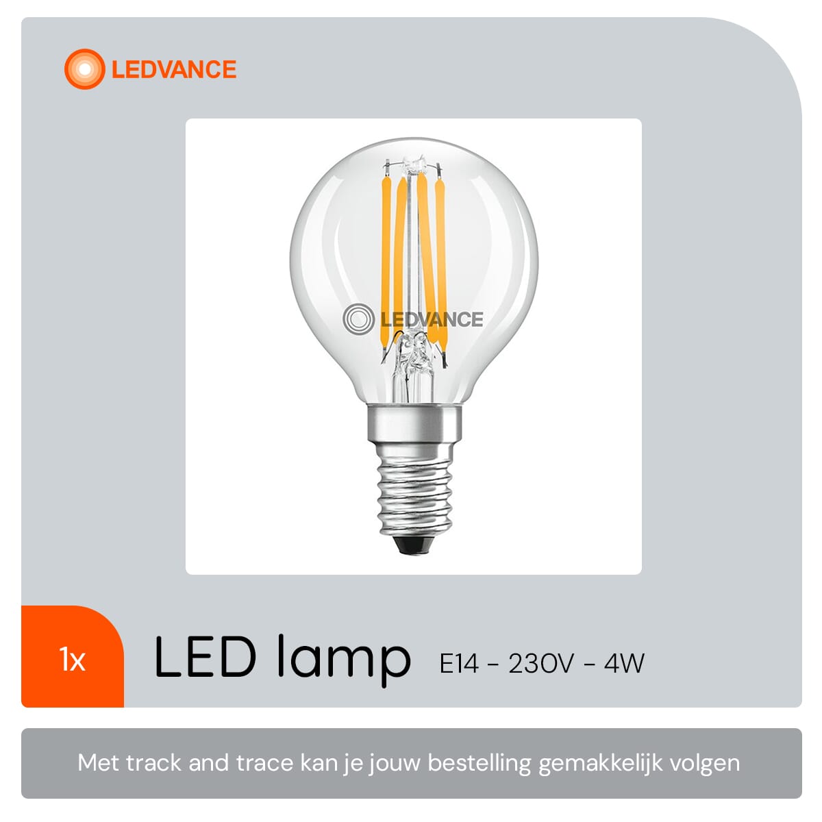 De Ledvance LED Filament Kogellamp E14 is een energiezuinige lichtbron die ideaal is voor gebruik in tafellampen, wandlampen en als sfeerverlichting. Met een vermogen van 4W en een lichtopbrengst van 470 lumen, biedt deze lamp een warm wit licht van 2700K. Het heldere glas en de klassieke filamentstijl zorgen voor een traditionele uitstraling, terwijl de moderne LED-technologie zorgt voor efficiëntie en duurzaamheid.