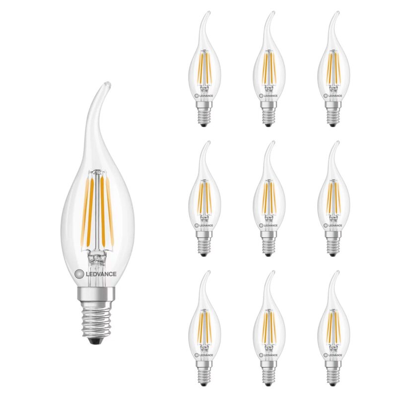 De Ledvance LED Filament Kaarslamp E14 is een energiezuinige lichtbron die ideaal is voor gebruik in klassieke interieurs, wandlampen en horecagelegenheden. Deze lamp heeft een vermogen van 3.4W en levert een lichtopbrengst van 470 lumen. Met een kleurtemperatuur van 2700K straalt de lamp een warm wit licht uit, wat zorgt voor een gezellige en uitnodigende sfeer. De lamp is voorzien van mat glas en heeft een diameter van 35mm. Deze set bevat 10 stuks, waardoor je meerdere ruimtes kunt verlichten.