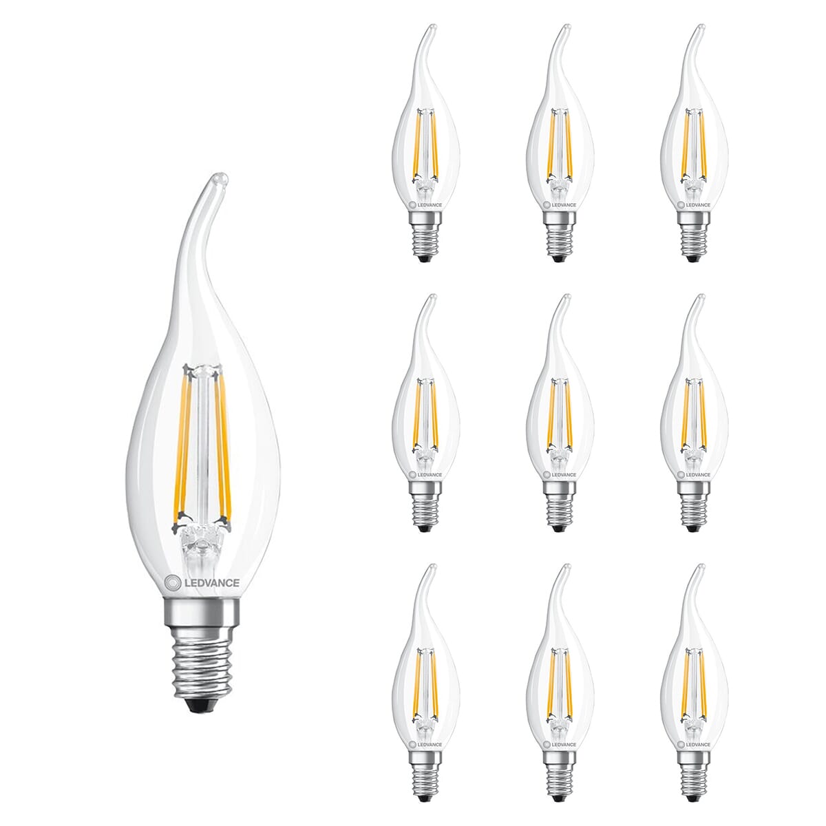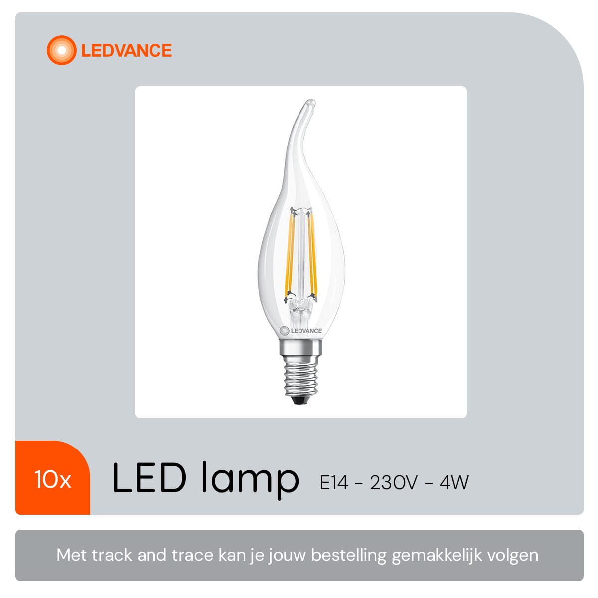 De Ledvance LED Filament Tipkaars E14 is een energiezuinige lichtbron die ontworpen is om traditionele gloeilampen te vervangen. Met een vermogen van 4 watt en een lichtopbrengst van 470 lumen, biedt deze lamp een warm wit licht van 2700K. De lamp is geschikt voor gebruik in kroonluchters, wandlampen en andere sfeerverlichtingstoepassingen. Deze verpakking bevat 10 stuks, ideaal voor grotere verlichtingsprojecten.