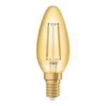 De Osram Vintage 1906 LED Kaarslamp heeft een goudkleurig glas dat een warme en uitnodigende sfeer creëert. Het filament ontwerp geeft de lamp een authentieke vintage uitstraling, ideaal voor klassieke en decoratieve armaturen.