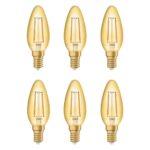 De Osram Vintage 1906 LED Kaarslamp heeft een klassiek ontwerp dat doet denken aan de gloeilampen van vroeger. Het goudkleurige glas en de kaarsvorm maken het een stijlvolle keuze voor traditionele en moderne interieurs.