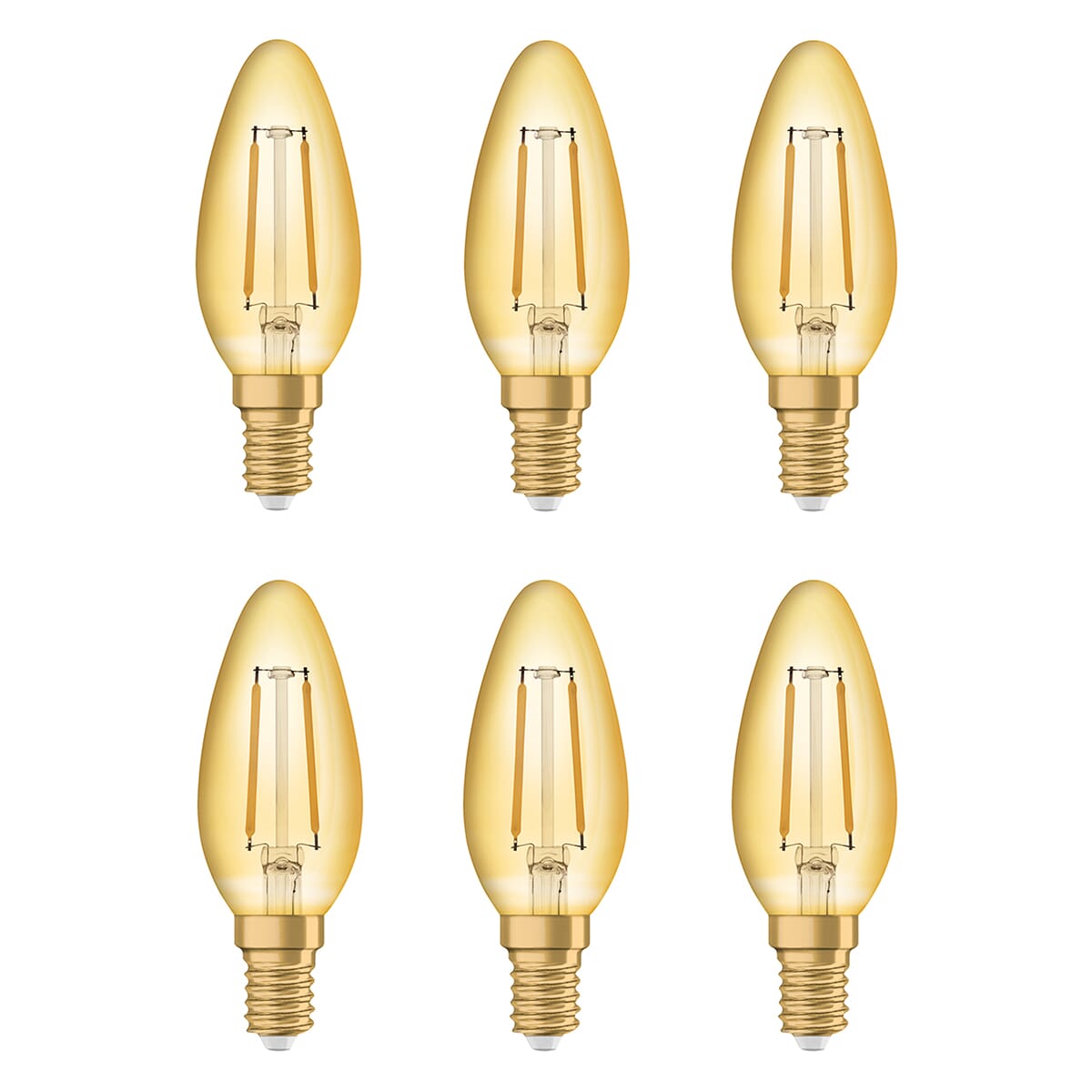 De Osram Vintage 1906 LED Kaarslamp E14 is een energiezuinige lichtbron die een warme en sfeervolle verlichting biedt. Deze kaarslamp is ontworpen met een retro uitstraling en is ideaal voor gebruik in wandlampen en hotels. Met zijn goudkleurige glas en extra warm witte lichtkleur voegt deze lamp een vleugje nostalgie toe aan elke ruimte.
