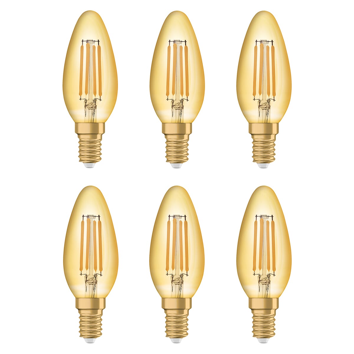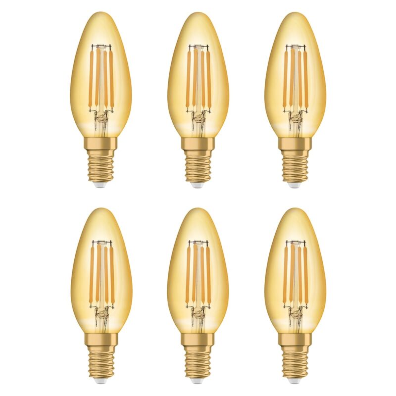 De Osram Vintage 1906 LED Kaarslamp E14 is een stijlvolle verlichtingsoplossing die een warme en uitnodigende sfeer creëert. Deze retro LED kaarslamp is ontworpen met een goudkleurig glas en biedt een extra warm wit licht van 2400K. Met een vermogen van 4W en een lichtopbrengst van 410 lumen is deze lamp ideaal voor gebruik in luxe hotels, restaurants en woonkamers. De lamp heeft een diameter van 35mm en wordt geleverd in een set van zes stuks.