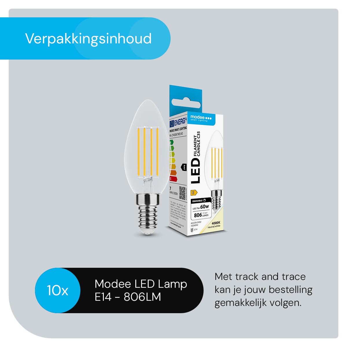 Modee E14 LED Lamp Dimbaar 7W – 806lm – 4000K – Neutraal Wit – LED Filament Kaarslamp B35 – Vervangt 50W Halogeen Gloeilamp – 10 stuks