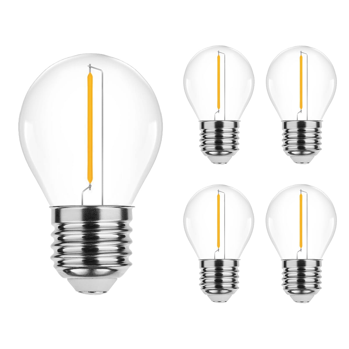 De Modee E27 LED Filament Lamp is een energiezuinige lichtbron die een warme en gezellige sfeer creëert in elke ruimte. Deze LED kogellamp, met een vermogen van 1W, vervangt traditionele 10W gloeilampen en biedt een lichtopbrengst van 70 lumen. De lamp heeft een kleurtemperatuur van 2700K, wat zorgt voor een extra warm wit licht. Deze set bevat vijf stuks, ideaal voor gebruik in verschillende armaturen binnen je huis.
