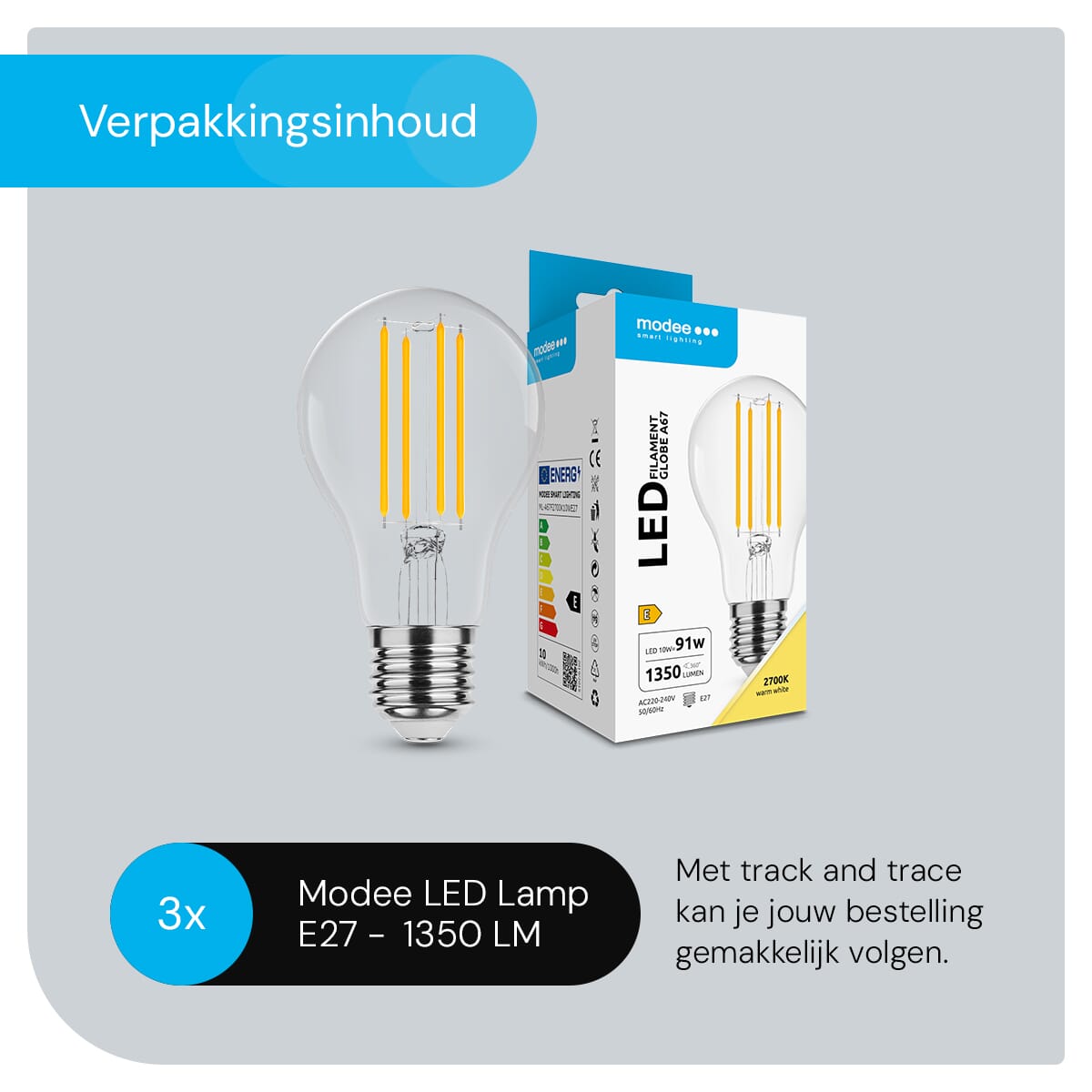 Modee E27 LED Lamp 10W – 1350lm – 2700K – Warm Wit – LED Filament Globe A67 – Vervangt 90W Halogeen Gloeilamp – 3 stuks