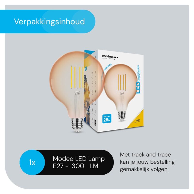 Modee E27 LED Lamp Dimbaar 4W – 300lm – 1800K – Warm Wit – LED Filament Amber Globe G125 – Vervangt 28W Halogeen Gloeilamp – 1 stuk
