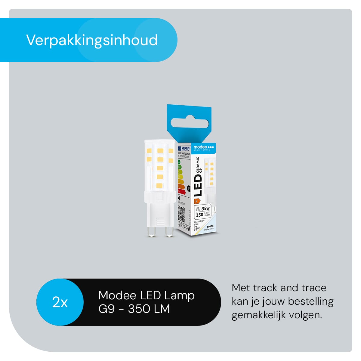 - Hoeveel lampen zitten er in een verpakking? Elke verpakking bevat 2 stuks Modee LED Lampen G9.
