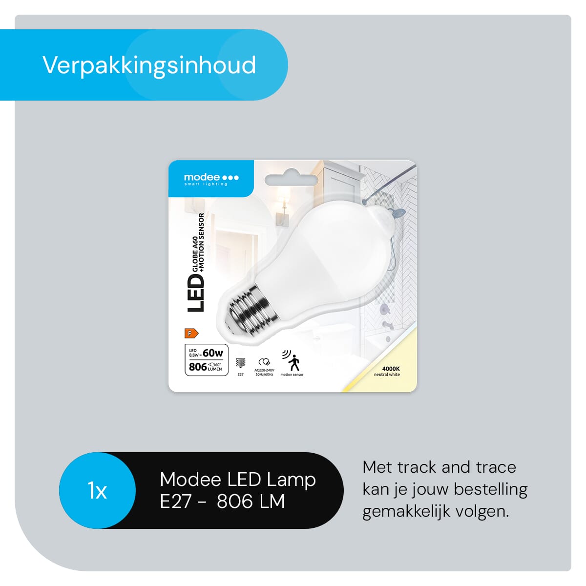 Modee Smart E27 LED Lamp 8.8W Bewegingssensor – 806lm – 4000K – Neutraal Wit – Globe A60 – Vervangt 60W Halogeen Gloeilamp – 1 stuk