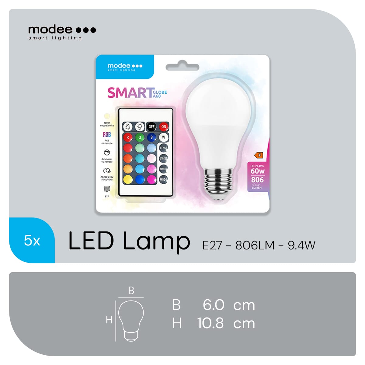 Modee Smart E27 LED Lamp met Afstandsbediening – Slimme RGB en Neutraal Witte Lamp – 5 Stuks
