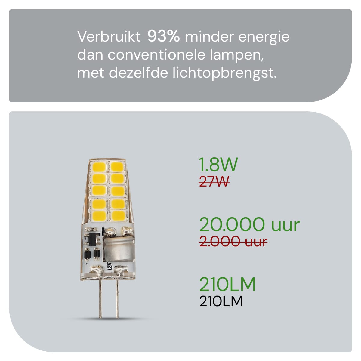 De OE Lightning G4 LED Lampen verbruiken slechts 1.8W per lamp, wat resulteert in een aanzienlijke energiebesparing. Deze steeklampjes zijn de perfecte keuze voor bewuste consumenten die waarde hechten aan zowel hun energierekening als het milieu.