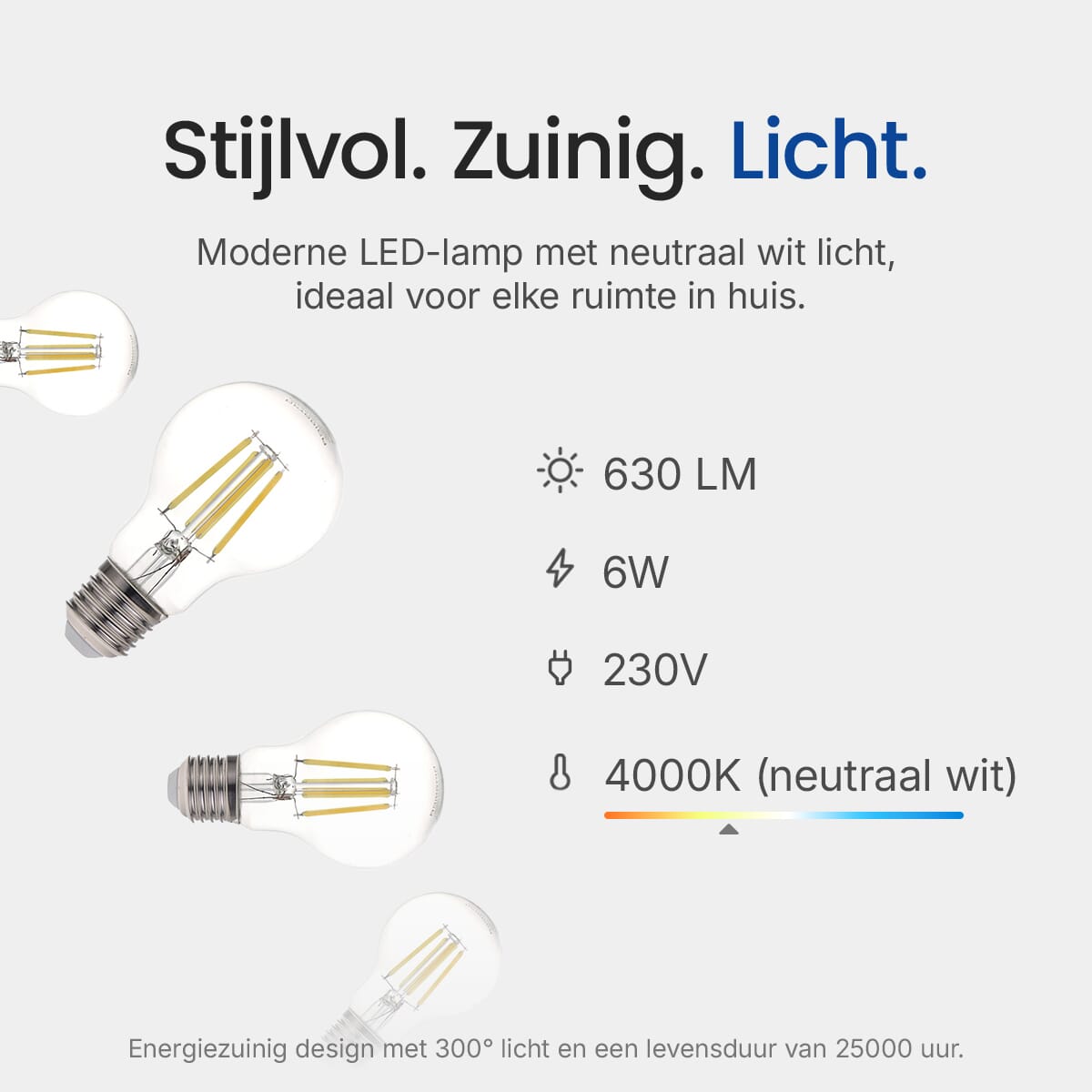 De Optonica LED Filament Lamp A60 E27 is een energiezuinige lichtbron die ontworpen is om traditionele 40W gloeilampen te vervangen. Met een vermogen van slechts 6W biedt deze lamp een helderheid van 630 lumen en een neutraal wit licht van 4000K. Deze lamp is geschikt voor gebruik in diverse omgevingen, zoals woonkamers, kantoren en commerciële ruimtes, en werkt op een standaard 230V aansluiting.