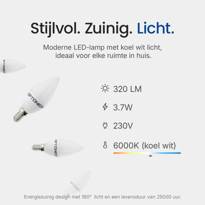 De Optonica LED Kaarslamp C37 E14 is een energiezuinige verlichtingsoplossing die ontworpen is om traditionele 25W gloeilampen te vervangen. Met een vermogen van slechts 3.7W biedt deze lamp een helderheid van 320 lumen en een koel wit licht van 6000K. Deze lamp is geschikt voor gebruik in diverse armaturen met een E14 fitting en werkt op een standaard netspanning van 230V. De verpakking bevat vijf stuks, ideaal voor het verlichten van meerdere ruimtes in huis.
