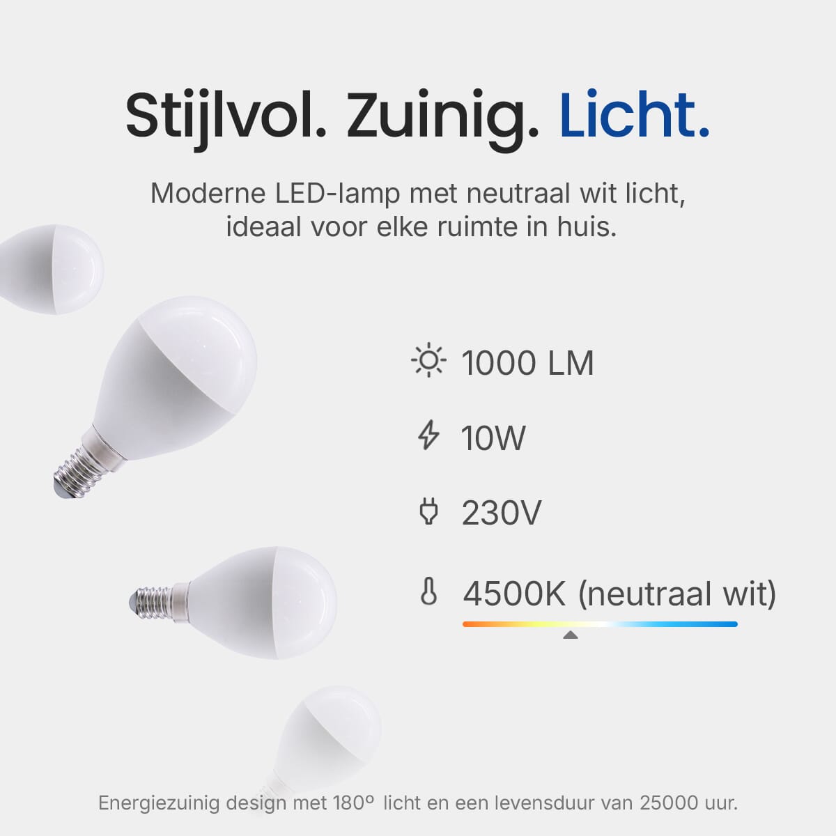 De Optonica LED Kogellamp G45 E14 is een energiezuinige lichtbron die ontworpen is om traditionele gloeilampen te vervangen. Met een vermogen van 10W biedt deze lamp een lichtopbrengst die vergelijkbaar is met een 85W gloeilamp. De lamp straalt een neutraal wit licht uit met een kleurtemperatuur van 4500K, wat ideaal is voor ruimtes waar helder en natuurlijk licht gewenst is.