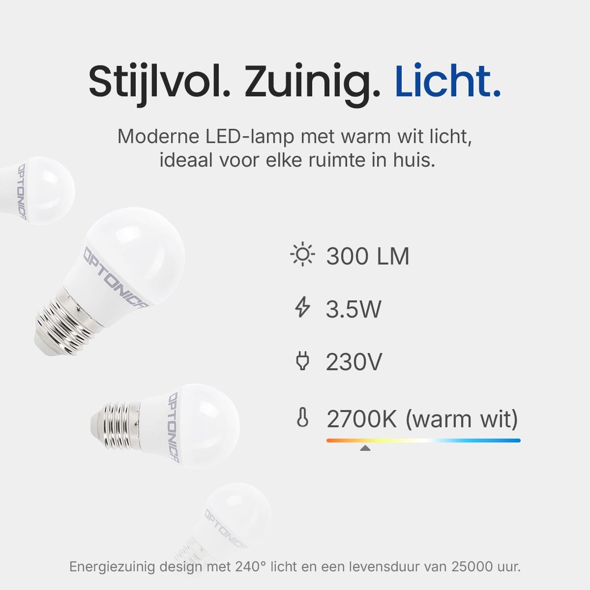 De Optonica LED Kogellamp is ontworpen met energie-efficiëntie in gedachten. Met een verbruik van slechts 3.5W bespaart deze lamp aanzienlijk op energiekosten in vergelijking met traditionele gloeilampen van 25W.