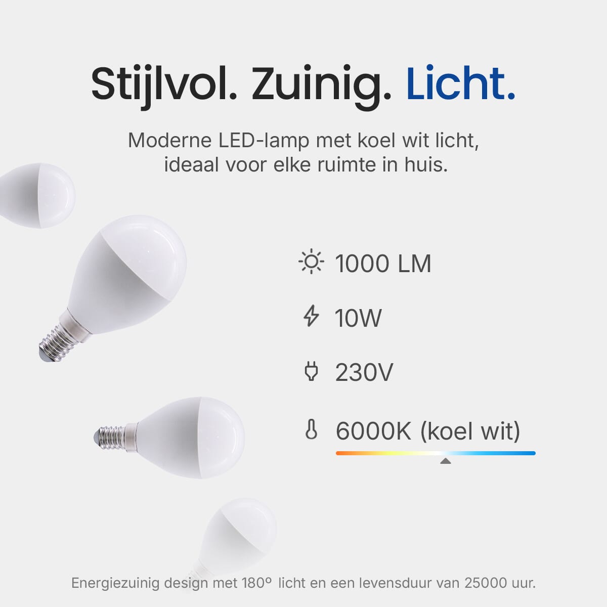 De Optonica LED Kogellamp G46 E14 is een energiezuinige lichtbron die ontworpen is om traditionele 85W gloeilampen te vervangen. Met een vermogen van 10W levert deze lamp een helderheid van 1000 lumen, wat zorgt voor een efficiënte verlichting in diverse ruimtes. De lamp straalt een koel wit licht uit met een kleurtemperatuur van 6000K, ideaal voor werkruimtes en plekken waar helder licht gewenst is.
