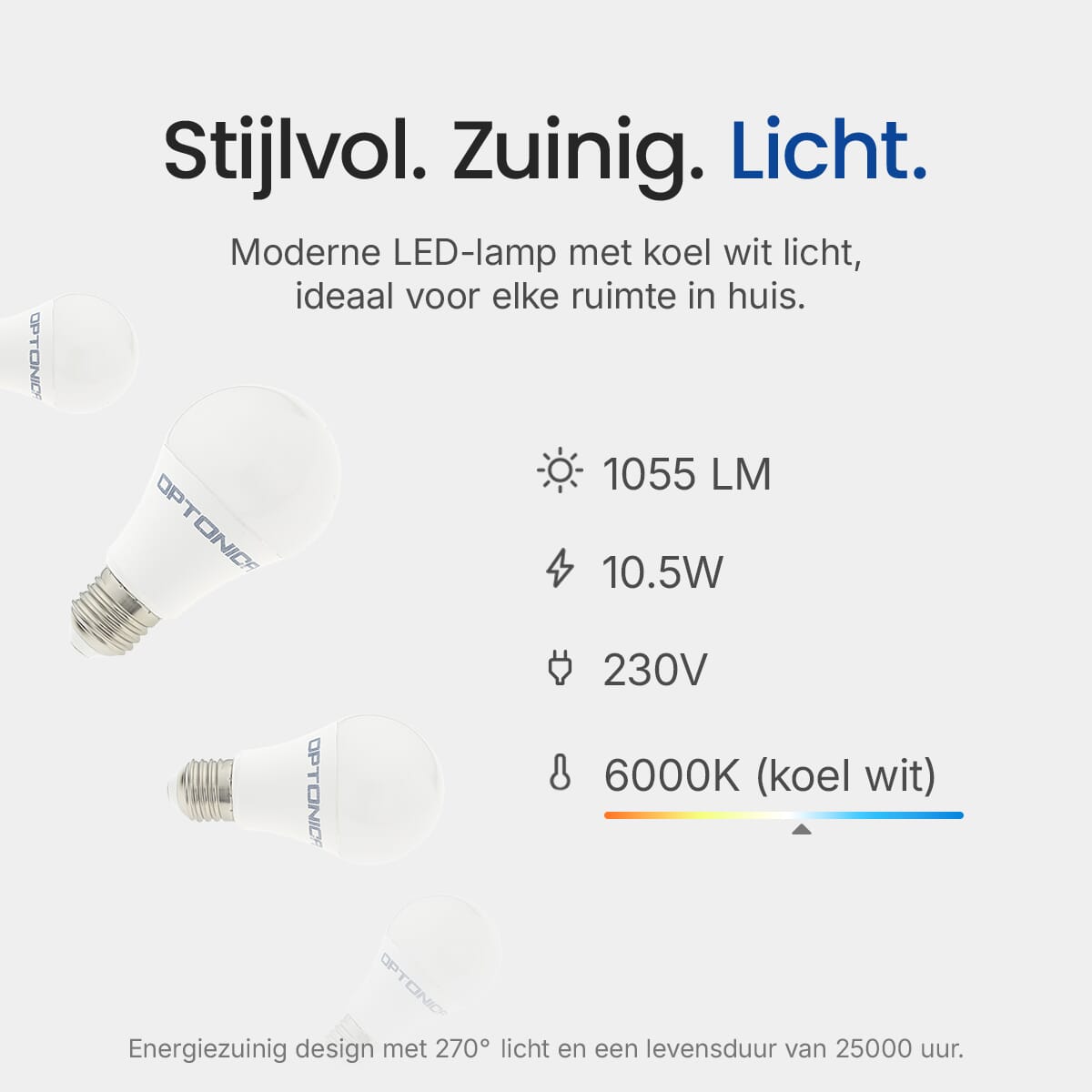 De Optonica LED Lamp A60 E27 is een energiezuinige verlichtingsoplossing die ontworpen is om traditionele 90W gloeilampen te vervangen. Met een vermogen van slechts 10.5W biedt deze lamp een helderheid van 1055 lumen, wat zorgt voor een efficiënte en krachtige verlichting. De lamp straalt een koel wit licht uit met een kleurtemperatuur van 6000K, ideaal voor ruimtes waar helder en natuurlijk licht gewenst is.