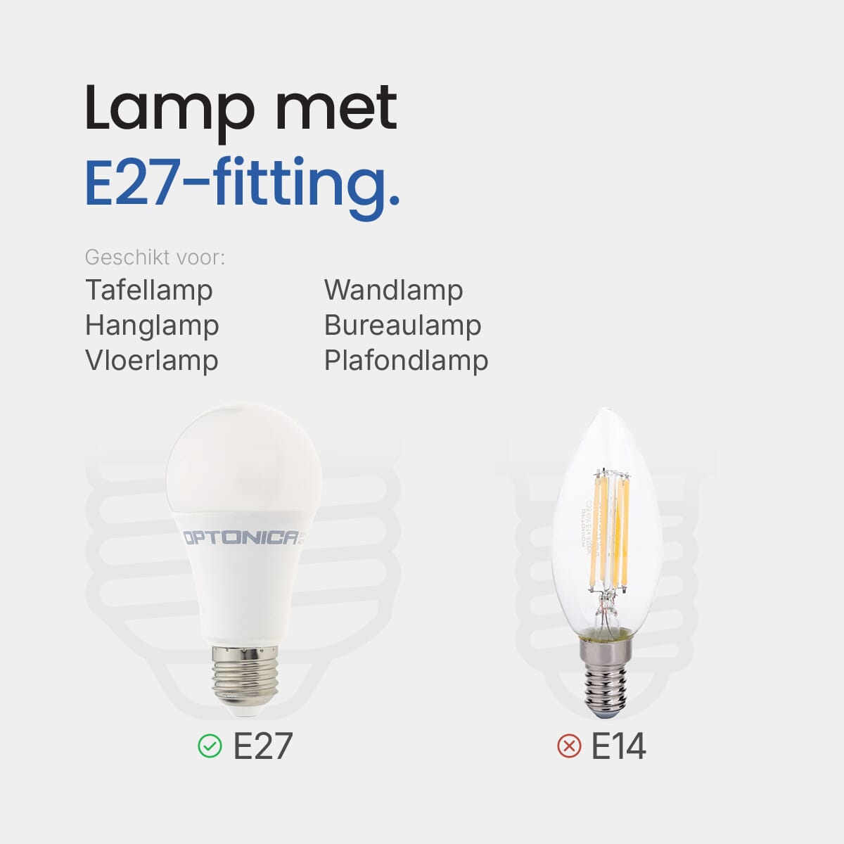 De lamp is voorzien van een E27 fitting, wat een van de meest voorkomende fittingen is, en werkt op een standaard 230V netspanning. Dit maakt de installatie eenvoudig en compatibel met de meeste bestaande armaturen.