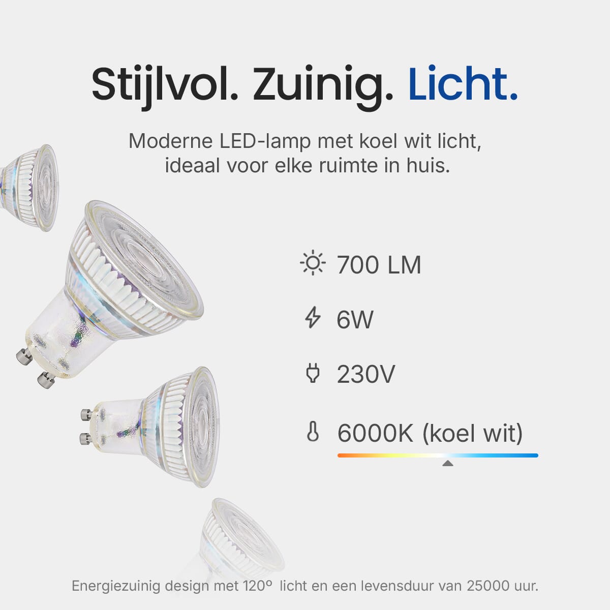 - Kleurtemperatuur: 6000K (Koel Wit)