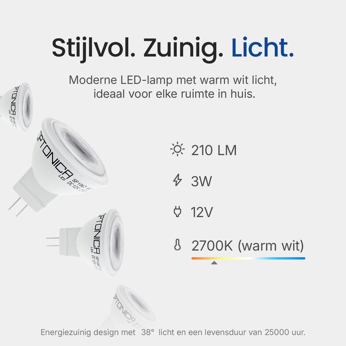 De Optonica LED Spot GU4 MR11 is een energiezuinige verlichtingsoplossing die ontworpen is om traditionele 20W halogeenlampen te vervangen. Met een vermogen van slechts 3W biedt deze LED spot een lichtopbrengst van 210 lumen, wat zorgt voor een warm wit licht van 2700K. Deze spot is ideaal voor gebruik in huiselijke omgevingen waar sfeervolle verlichting gewenst is.