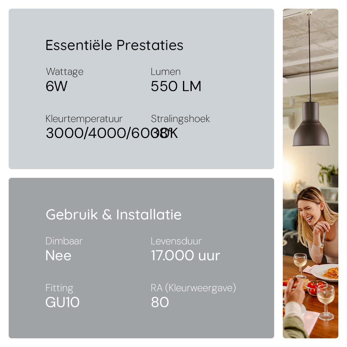 Met de Spectrum LED Lamp GU10 kun je de kleurtemperatuur aanpassen van warm wit (3000K) tot koel daglicht (6000K). Dit maakt de lamp ideaal voor verschillende ruimtes en activiteiten, van ontspannen in de woonkamer tot geconcentreerd werken in je thuiskantoor.