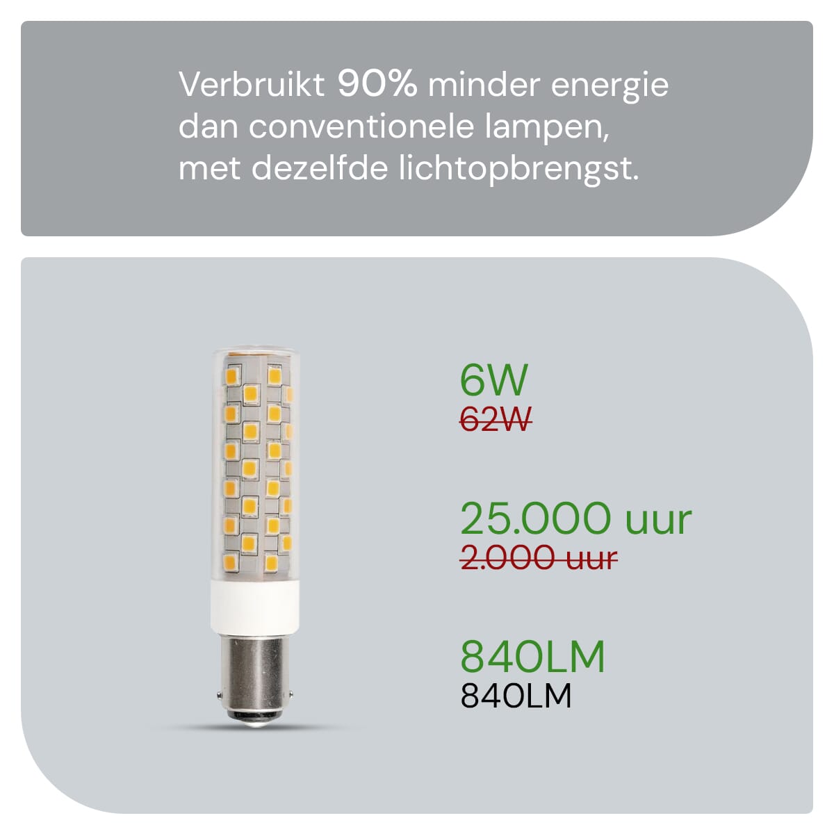 Met een vermogen van slechts 6 watt is de SPL Ba15d LED lamp een uitstekende keuze voor wie zijn energierekening wil verlagen. Ondanks het lage verbruik levert deze lamp een indrukwekkende lichtopbrengst van 840 lumen, wat hem perfect maakt voor zowel thuis- als professionele omgevingen.