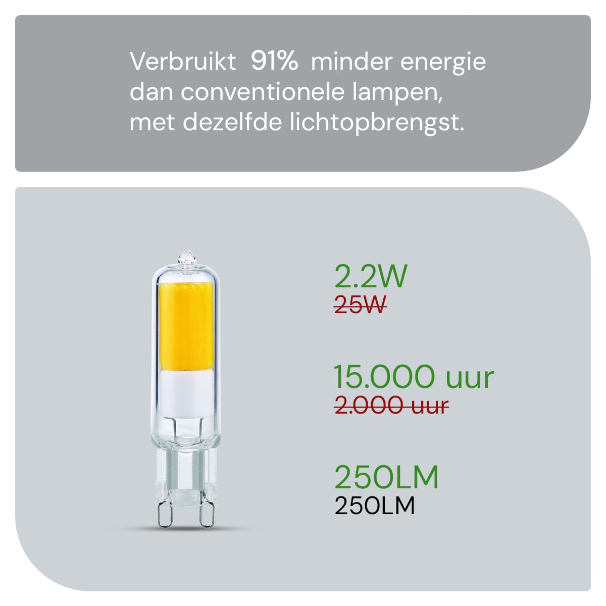 Bespaar op je energierekening zonder in te leveren op helderheid. Deze G9 LED lampen gebruiken slechts 2.2W, wat betekent dat je een lagere energierekening hebt terwijl je toch geniet van een helder en consistent licht. Ideaal voor wie bewust omgaat met energieverbruik.