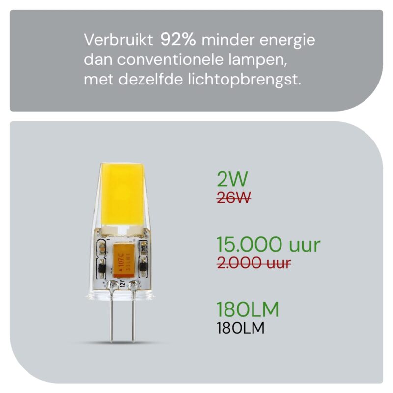De SPL LED Steeklamp G4 verbruikt slechts 2W, wat betekent dat je aanzienlijk bespaart op je energierekening. Dit is een groot voordeel ten opzichte van traditionele halogeenlampen die veel meer energie verbruiken.