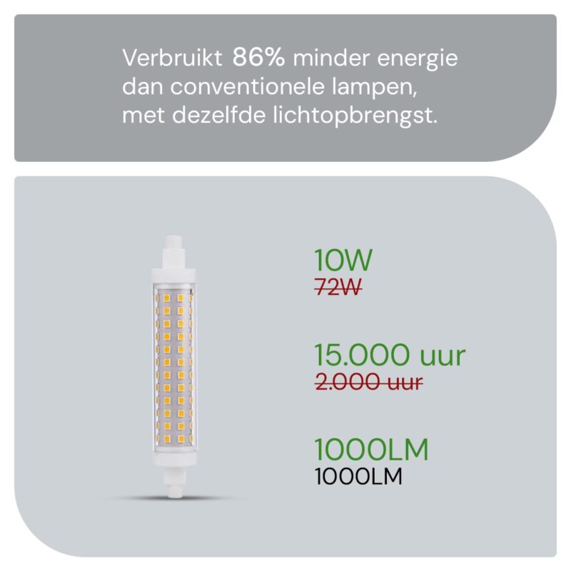 Met een energieverbruik van slechts 10W levert de SPL R7s LED Lamp maar liefst 1000 lumen. Dit betekent dat je kunt genieten van helder en krachtig licht zonder je zorgen te maken over hoge energiekosten. De lamp is ideaal voor zowel residentiële als commerciële toepassingen, waar efficiëntie en helderheid essentieel zijn.